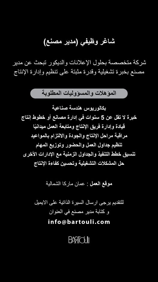 مطلوب مدير مصنع مقالات ذات صلة إعلان توظيف – سلسلة مطاعم بروستو مطلوب موظفين للإنضمام لأسرة فوود جيت ماركت مطلوب سائقي فئة رابعة و فئة خامسة لدى مصانع الاسفنج العربية اعلان للشركة القيادية للتسويق