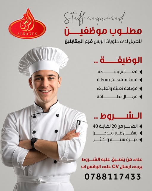 مطلوب موظفين للعمل لدى حلويات الريس فرع المقابلين